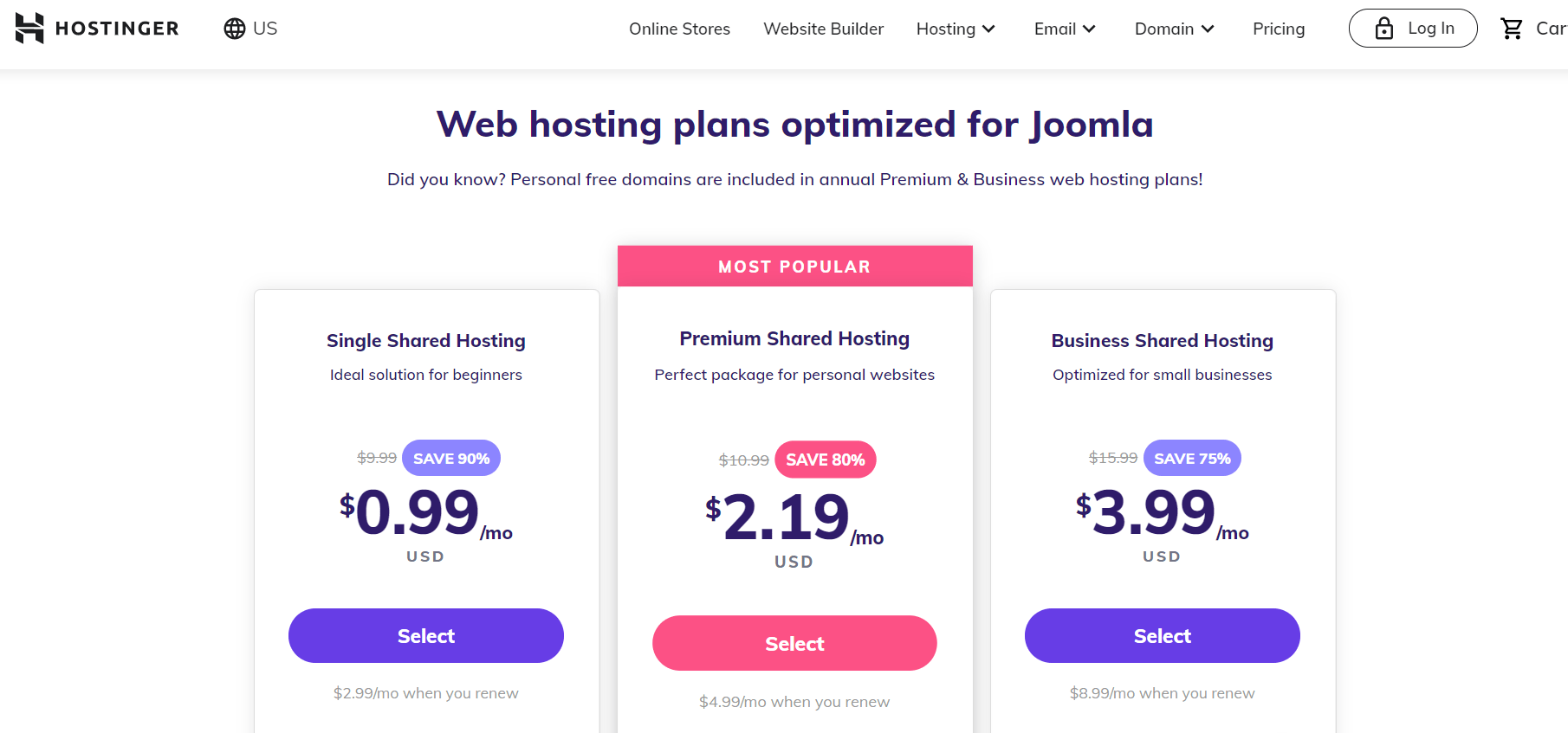 - Hostinger ($0.99/per month) : Cheapest Joomla Hosting Provider